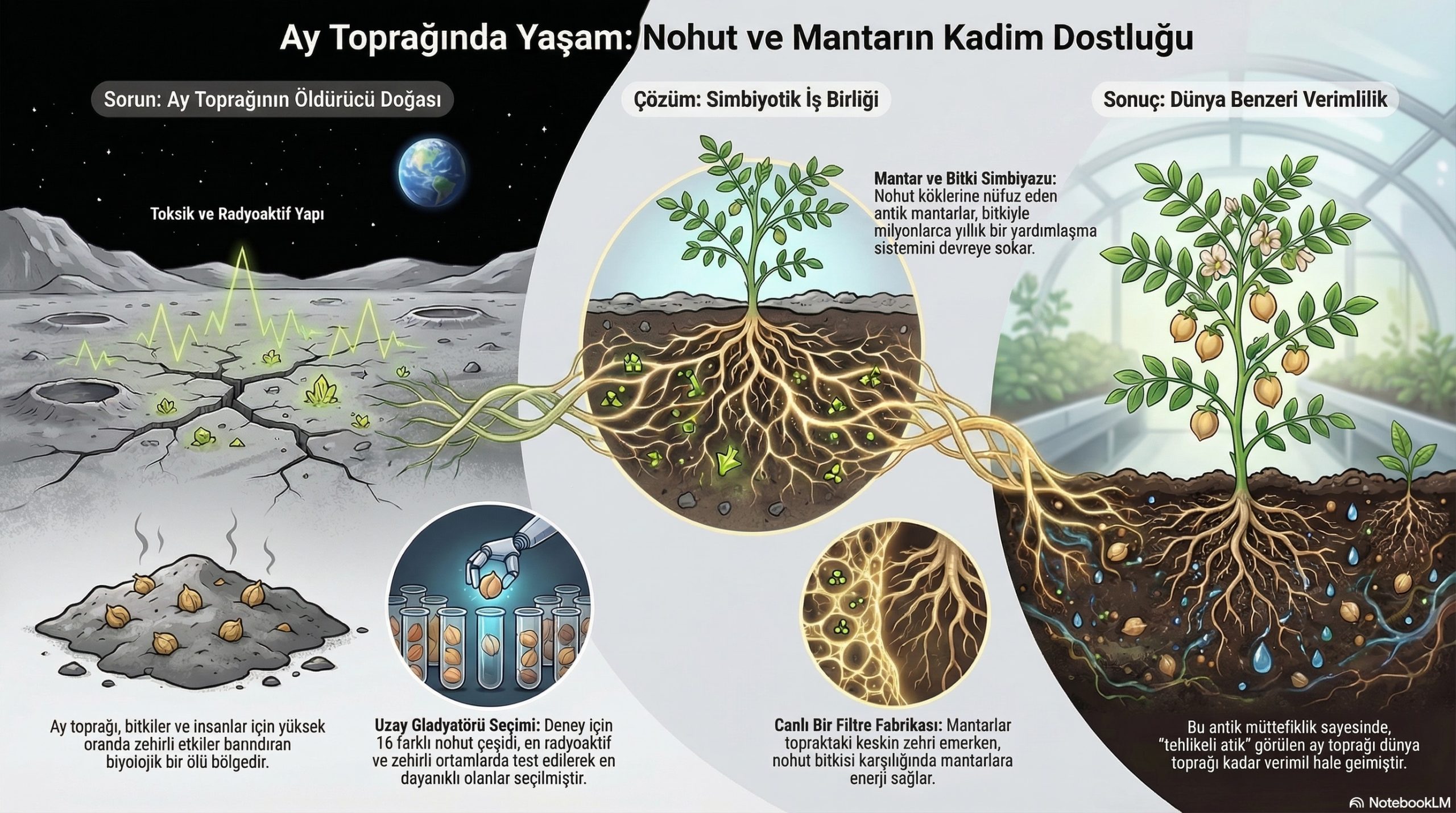 "Nohut bitkisi mantarlara enerji verirken, mantarlar ay toprağındaki o keskin zehri emen canlı bir fabrikaya dönüştü."